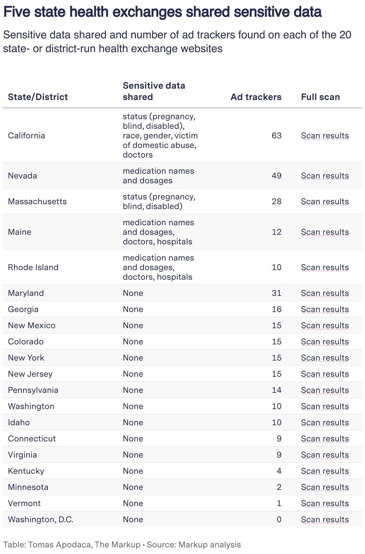 The Markup and CalMatters audited the websites of all 19 states that independently operate their own online health exchange. While most of the sites contained advertising trackers of some kind, The Markup and CalMatters found that four states exposed visitors' sensitive health information.